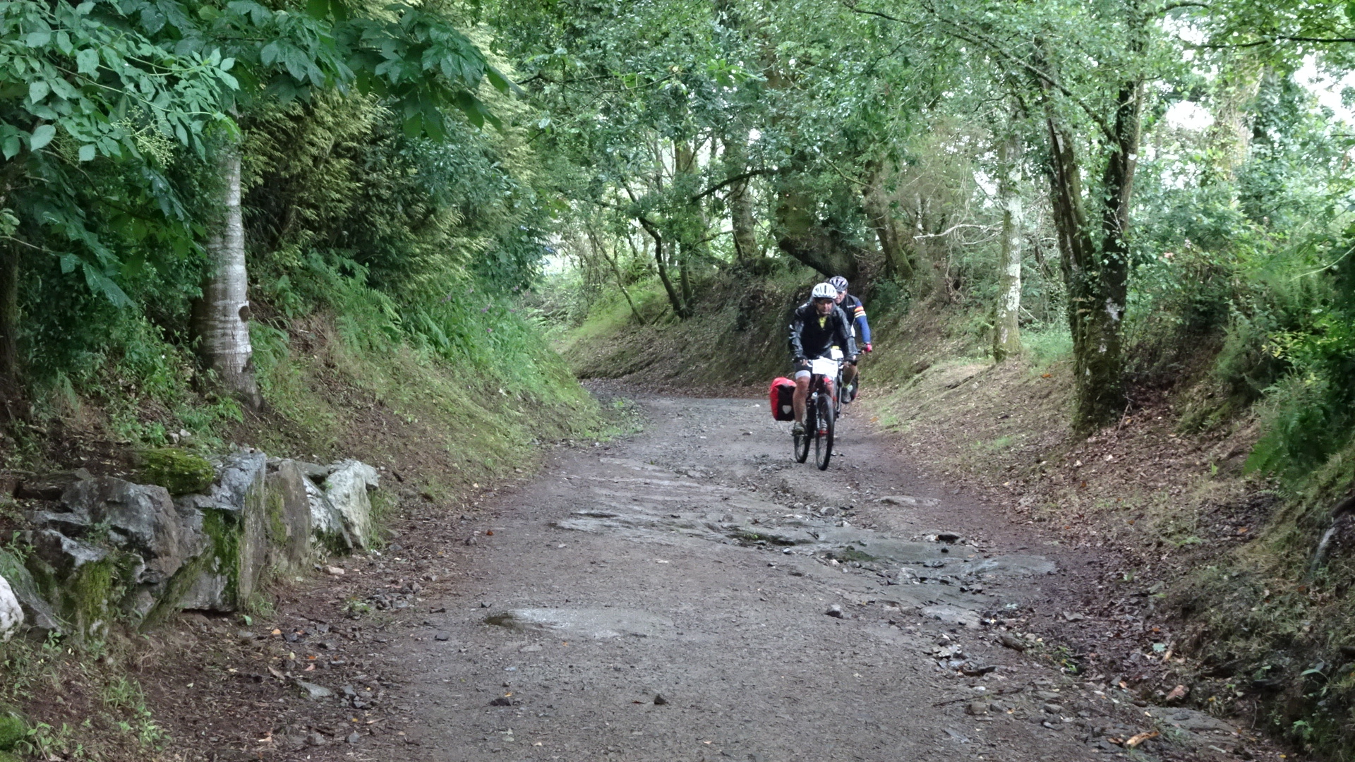 En un momento dado el camino se torna imposible por lo empinado que es. Nos toca poner el pie en tierra a todos y sufrimos lo indecible tirando de las bicis por semejante cuesta. Para rematar, en los últimos metros, nos encontramos con unos grandes escalones naturales en los que nos tenemos que ayudar unos a otros para conseguir superarlos. Cuando conseguimos estar todos arriba estamos empapados de sudor y exhaustos.